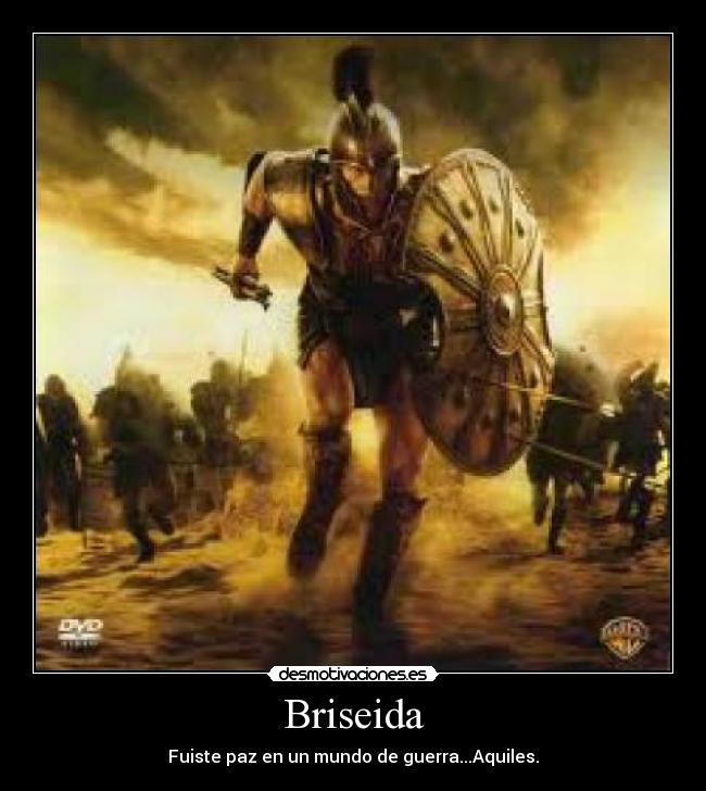 Briseida y aquiles se encuentran y aquiles le pide que se valla y la besa pero a lo lejos ven a paris, y le pide que valla con el, briseida se va personajes secundarios: Aun con lagrimas en los ojos y resignada por el trágico destino de aquiles escapaban de las flechas y lanzas que eran lanzadas por el ejercito del ya. Pasala el ejército griego asedió la ciudad de troya durante más de diez años. Luego de la muerte de aquiles, briseida y paris escapaban juntos por pasajes secretos al interior de la amurallada ciudad de troya que ardía en llamas.